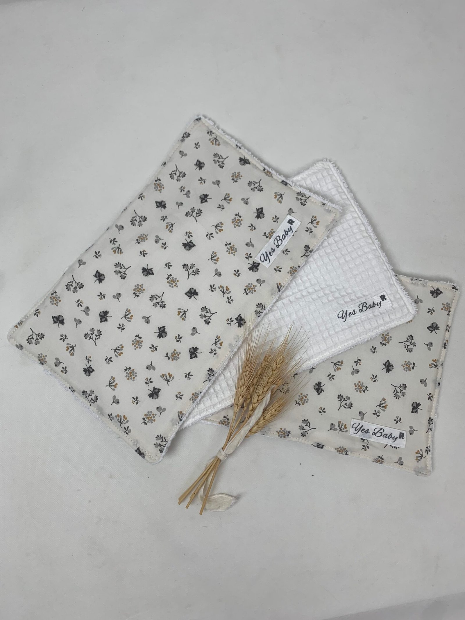 Por un lado de tela y por el otro de rizo. Puedes escoger 3 telas distintas o igiales. Medidas aprox. 23×15 cm. 100% algodón